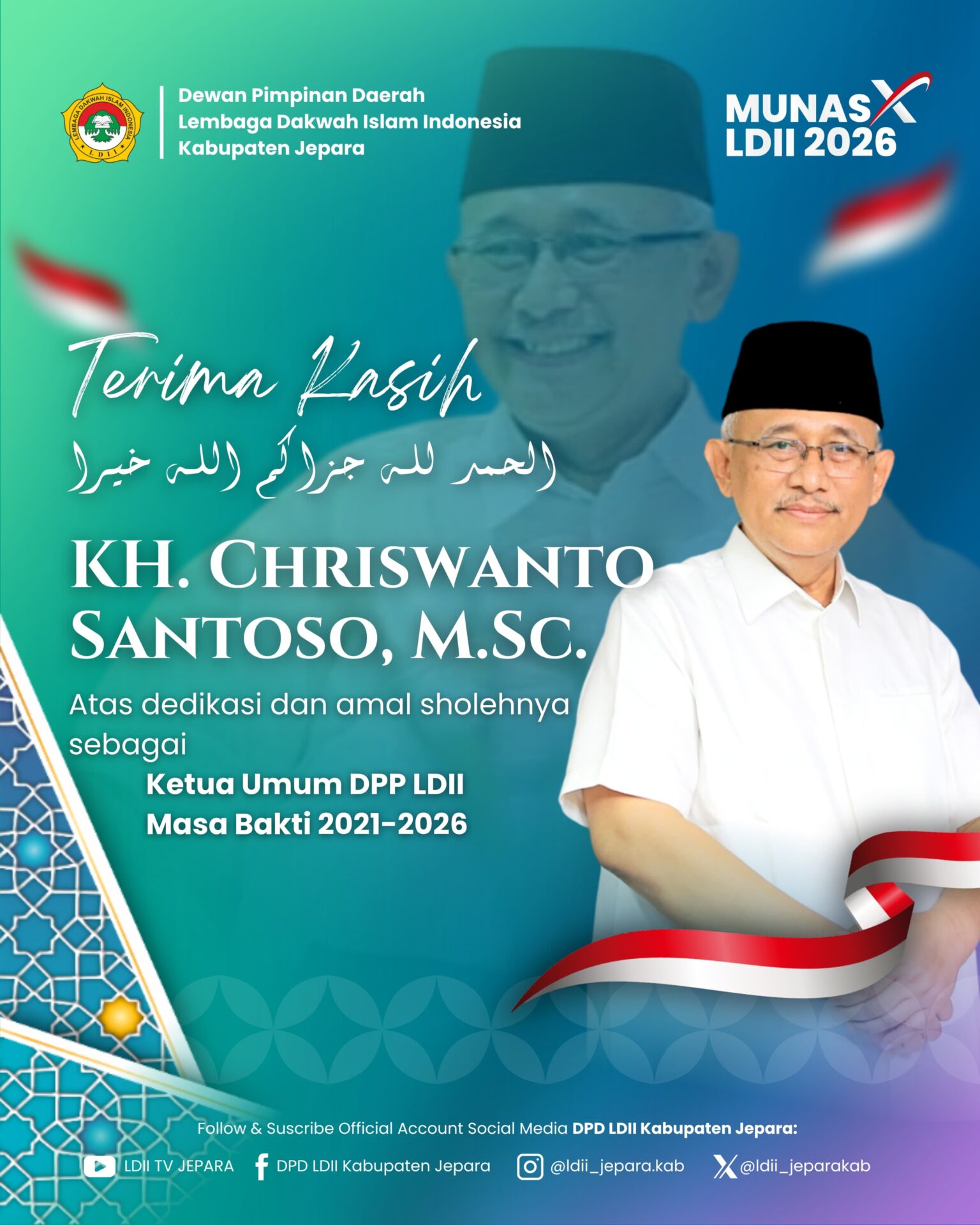 Keluarga Besar Lembaga Dakwah Islam Indonesia (LDII) menyampaikan terima kasih dan apresiasi setinggi-tingginya kepada KH. Ir. Chriswanto Santoso, M.Sc. atas dedikasi dan pengabdian sebagai Ketua Umum Dewan Pimpinan Pusat LDII masa bakti 2021–2026.